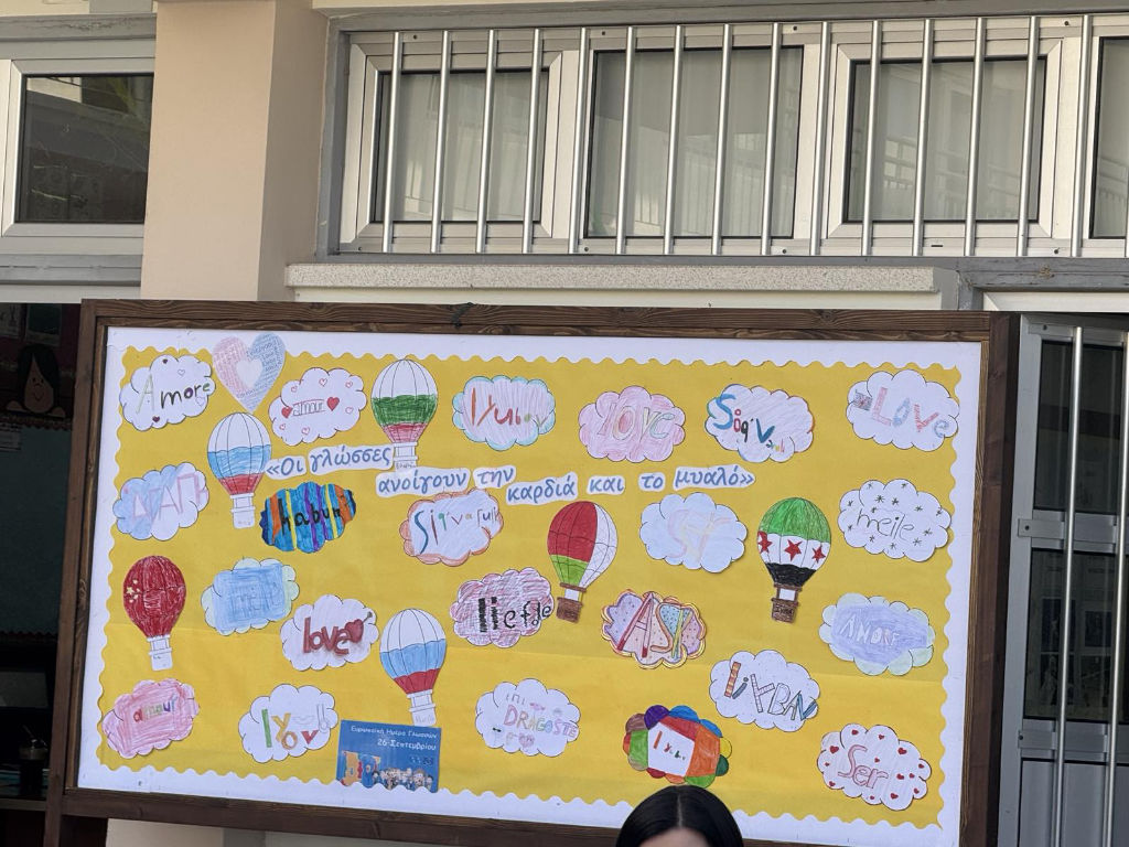Η Ευρωπαϊκή Ημέρα Γλωσσών γιορτάζεται από την Ευρωπαϊκή Επιτροπή κάθε χρόνο από το 2001. Η Ευρωπαϊκή Ένωση, με τα 450 εκατομμύρια πολίτες και τις 24 επίσημες γλώσσες της, είναι περήφανη για την πολυμορφία της αυτή, την οποία έχει σημασία να εκτιμήσουμε. Έτσι λοιπόν, η Ευρωπαϊκή Ημέρα Γλωσσών είναι μια καλή υπενθύμιση ότι μπορούμε να καμαρώνουμε για την τεράστια γλωσσική και πολιτιστική μας κληρονομιά. Τα παιδιά της Β΄2 και Γ΄1 έφτιαξαν πινακίδα με λέξεις από διάφορες χώρες, μας καλημέρισαν στη 16 διαφορετικές γλώσσες παιδιών του σχολείου μας και τραγούδησαν στη νοηματική γλώσσα.